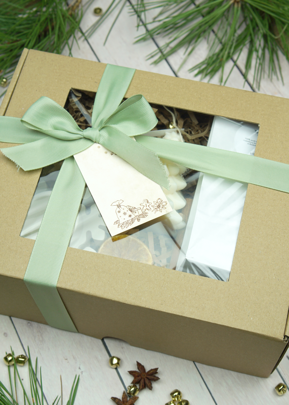 - wszystko zapakowane jest w eko pudełeczko z okienkiem oraz przewiązane jest wstążką.
