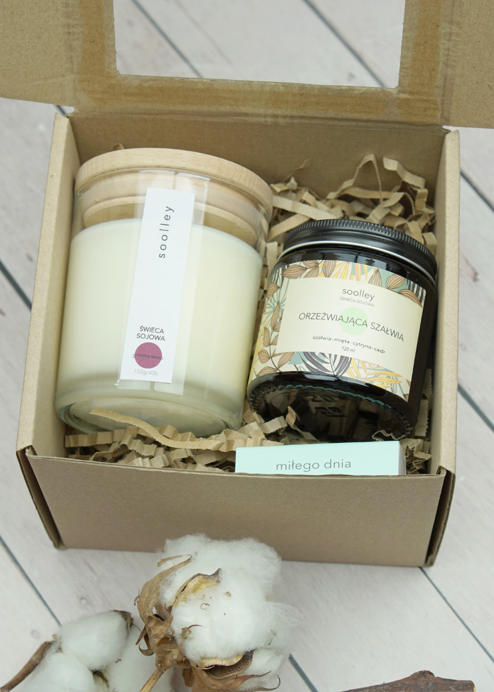 - mała świeca sojowa w brązowym słoiczku o wybranym zapachu, 90g.,
