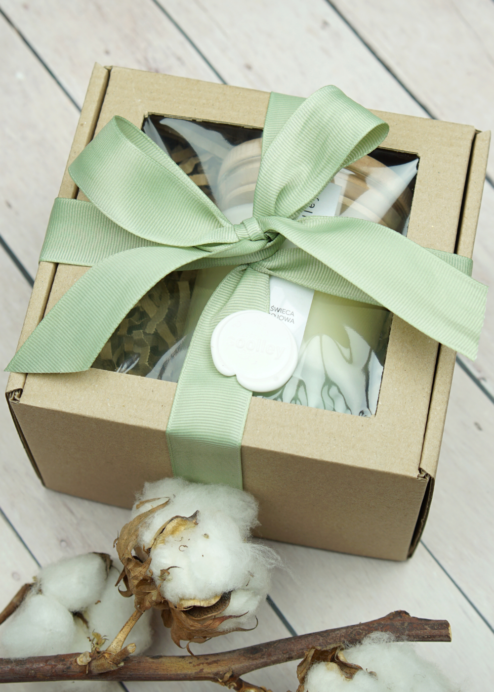 - wszystko zapakowane jest w eko pudełeczko z okienkiem oraz przewiązane jest wstążką.